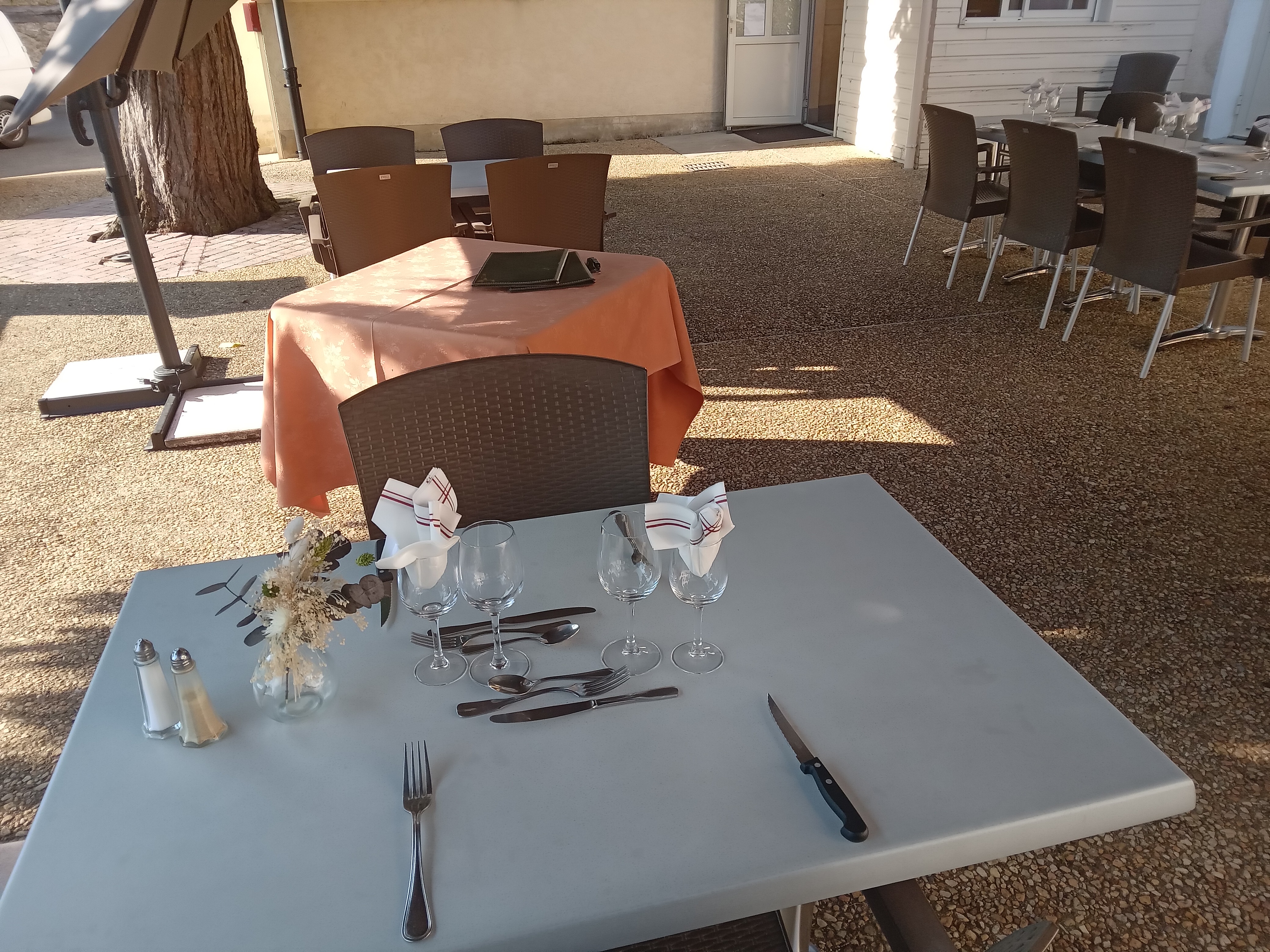 Aux beaux jours, profitez d’un moment de détente sur la terrasse de notre restaurant, en plein cœur de la campagne. Entourée de verdure et bercée par le calme environnant, elle offre un cadre idéal pour savourer un repas en toute sérénité. L’hiver, notre cantou vous apporte chaleur et convivialité au bar.